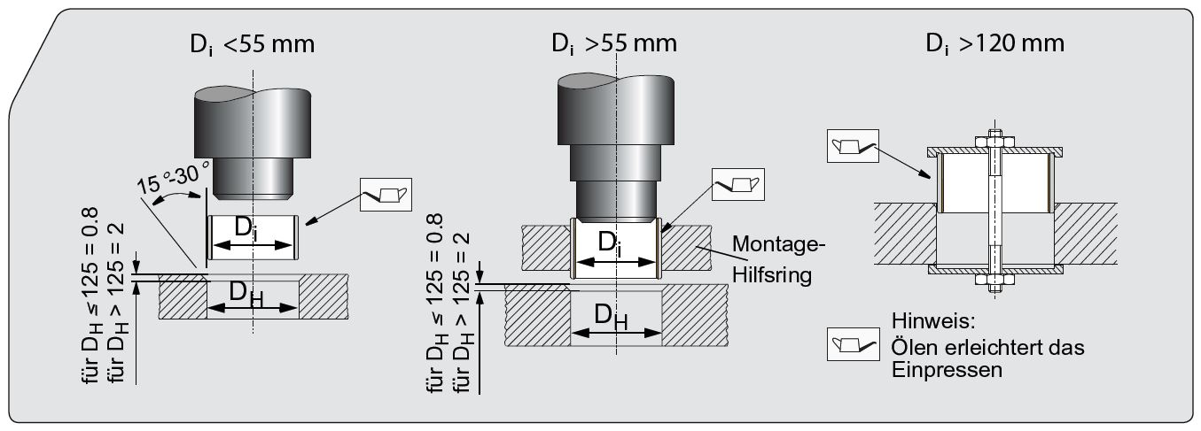 3. Montage grösserer Buchsen mit Stossfuge: Für grössere Buchsen empfiehlt sich der Einsatz eines Montagerings. Dieser gewährleistet eine präzise Ausrichtung und verhindert ein Verkanten des Lagers während des Einpressens.